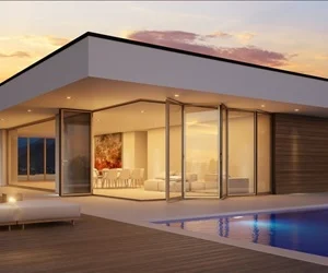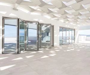 Oteller, modern evler ve ofis binaları gibi geleneksel yapılara ve büyük inşaatlara uygun üstten askılı, ısı yalıtımsız kayar-katlanır kapı sistemi.